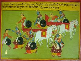 | Description / विवरण | Miniature painting based on Mahabharat - Virat parva depicting when Arjun did not take back the chariot Uttar get down from the chariot and start running. Then Arjun also get down and catch Uttar and tied him on the chariot. Then Uttar ask Arjun to leave him and says that he will give her 100 queens, 8 gram gold and 10 drive his chariot, so that he can fight with Kaurava on behalf of Uttar. |