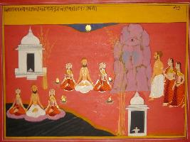| Description / विवरण | Miniature painting depicting one saint meditiating with two females |