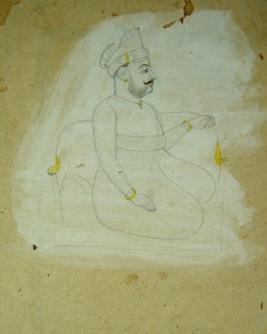 | Description / विवरण | Miniature portrait of a king sitting on a couch facing left. It is an unfinished painting. |