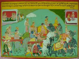 | Description / विवरण | Miniature painting based on Mahabharat - Virat parva. The painting depicts the chaupar game that played by Viratraj and Kamka while it also depict the merching against Susarma with a huge army including 10 thousand elephant. |