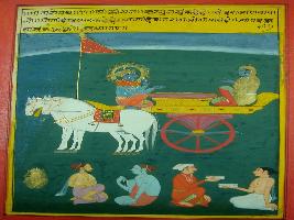 | Description / विवरण | Miniature painting based on Shri Bhagwat Gita. It depicts Krishna preaching Arjun one who knows about all Vedas he gets vitraj yoga. |