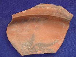| Description / विवरण | Potsherd of red and black ware, with some part of black design visible in inner side. It is a sherd of Fabric D. It seems that it is a broken sherd of a basin. |