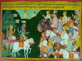 | Description / विवरण | Miniature painting based on Mahabharat - Virat parva depicting prince Uttar ask Arjun to return back from the battle field by seeing the heroes like Karna, Bhishma, Drona, Kripacharya etc. But Arjun assuring him and ask him to have patience. But Uttar ask him to go back. |