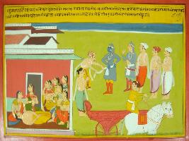 | Description / विवरण | Miniature painting based on Mahabharat - Musal parva. Valdi is telling Arjun that on the seventh day from today Vasudev will die. Vasudev is depicted with his queens, whoare sitting near to him. |