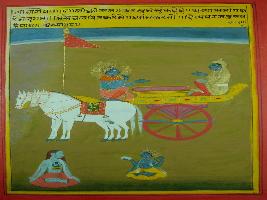 | Description / विवरण | Miniature painting based on Shri Bhagwat Gita. It depicts Krishna preaching Arjun that by practice one can stable and purify his inner consciousness through meditation. It can be achieved by Divya Param Purush. |