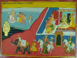 | Description / विवरण | Miniature painting based on Mahabharat - Adi parva depicting Parikshit moving forward with his men. On the upper left king Parikshit is sitting in his court. At the right side Brahma is sitting with three Brahmans and Naga Vasuki worshipping him. |