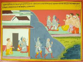 | Description / विवरण | Miniature painting based on Mahabharat - Musal parva. Arjun is depicted with a man who is accompanying him every where, both depicted with various peoples. |