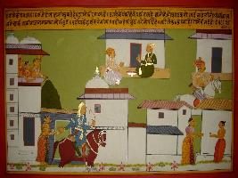 | Description / विवरण | Miniature painting based on Prithviraj Raso depicting Prithviraj roaming in Kannauj while Sanjogita saw him from the palatial balcony and asking the qualities of Prithviraj to her friends. |