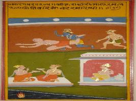 | Description / विवरण | Miniature painting based on Sarangadhar depicting Krishna fighting Malla yudh with Gopas and moon is watching him. |