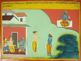 | Description / विवरण | Miniature painting based on Mahabharat - Musal parva. The painting depicts that Vasudev and Arjun is talking and Vasudev asked Arjun that he can meet Krishna in heaven and Dwarika would by destroyed by Tsunami of sea. |