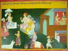 | Description / विवरण | Miniature painting based on Mahabharat - Virat parva. The painting depicts that the king of Virat is talking with four Pandavas while on the other side Draupadi is seen talking with the queen of Viratraj. |