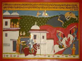 | Description / विवरण | Miniature painting based on Prithviraj Raso depicting Prithviraj and a friend of Sanjogita. The friend asks Prithviraj to marry Sanjogita who loved him very much and Prithviraj replies that he will elope with her even if he has to fight with the army of Jaichand. |