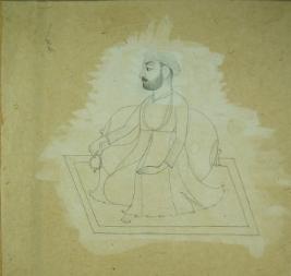 | Description / विवरण | Miniature portrait of a king in seated position, facing right. He is holding a rosary in right hand and left hand resting on the thigh. |