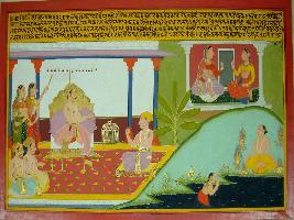 | Description / विवरण | Miniature painting based on Kadambari depicting a king on throne with 2 female attendants and 3 males are sitting in front of him with folded hands. In upper left part, 2 females are depicted, talking to each other and in lower left part, a yogi is in penance and another yogi is taking dip in river. |