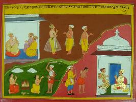 | Description / विवरण | Miniature painting based on Mahabharat - Adi parva depicting Parikshit sitting in his court when a sage, Shringi came and cursed him. The painting also depicts king talking to a man. The lower part depicts two Brahmans performing yagna and a man coming to kill them, but later king s soldiers arrested him. |