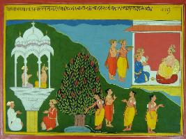 | Description / विवरण | Miniature painting based on Mahabharat - Adi parva depicting Parichaja and a Brahman coming and performing Rajasuya yagna. After performing the yagna the Brahman goes back taking some wealth with him. |