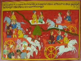 | Description / विवरण | Miniature painting based on Mahabharat - Virat parva. The painting depicts the bath Susarma and Virat raj s army where the Sarathi of Susarma is killed. On the upper part king of Virat is seen with his queen. |