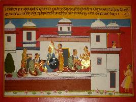 | Description / विवरण | Miniature painting based on Prithviraj Raso depicting Sanjogita and Prithviraj sitting on the palatial balcony and two female attendants are serving them while another man is seen in the left side of the painting. |