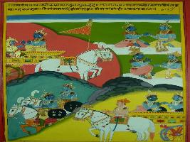 | Description / विवरण | Miniature painting based on Shri Bhagwat Gita. Krishna and Arjun where Krishna says to Arjun that fighting is his Dharma and he is born only to fight to establish peace in the creation. |