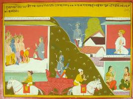 | Description / विवरण | Miniature painting based on Mahabharat - Musal parva. The painting depicts that Arjun is going to Dwarika and find nobody in the city. On the painting Vasudev and two Nayikas are seen in the left side of the painting. |