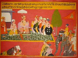| Description / विवरण | Miniature painting based on Prithviraj Raso depicting Prithviraj sitting in his court with courtesans and are deciding upon a plan. At the extreme right and lower panel his army shown. |