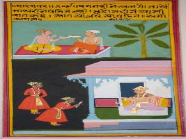| Description / विवरण | Miniature painting based on Sarangadhar depicting two scholar seated in the upper part of the painting, while on the lower part, a king is seen seated on throne and two men standing in front of him. |