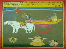 | Description / विवरण | Miniature painting based on Shri Bhagwat Gita. It depicts Krishna preaching Arjun that through adhyatmik character one would get Brahma. After performing karma, expression of human being had been installed. |