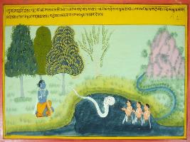 | Description / विवरण | Miniature painting based on Mahabharat - Musal parva. The painting shows that Krishna is sitting in vana and in front of him Sagulnaga is seen in the lake Sanivar . |