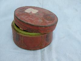 | Description / विवरण | This is a round wooden box with lid. It is decorated with geometrical pattern. It is painted by golden, red and black colour but the inner side is green. |