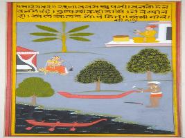 | Description / विवरण | Miniature painting based on Sarangadhar depicting a man seated and holding something in his hands, below it a lady smoking hookah and below her, a carpenter working on his ship and in the lower part a ship is depicted in the river. |
