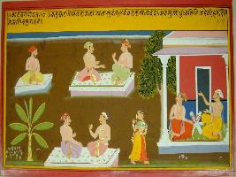 | Description / विवरण | Miniature painting based on Kadambari depicting at the upper right side a man sitting on a cushion. Next to it two men are depicted sitting on a cushion and in conversation. At the lower part also two men are talking to each other and a female is seen looking at them. At the left side two men are depicted sitting outside the house. |