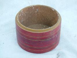 | Description / विवरण | This is a wooden box without lid. It has circular body with horizontal bands painted in yellow and black colour on red colour base. |