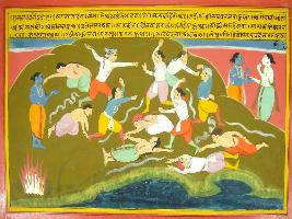 | Description / विवरण | Miniature painting based on Mahabharat - Musal parva. The painting depicts how the Yaduvansh destroyed by fighting each other and Krishna is seen on the painting in left up corner that talking with Baldev. |