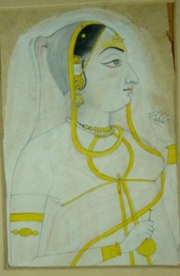 | Description / विवरण | Miniature painting of bust size portrait of a queen facing left and holding a pot in her right hand. She is well ornamented and borders of her cloth is painted with yellow colour. |