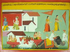 | Description / विवरण | Miniature painting based on Mahabharat - Musal parva depicting march of elephant, bullock cart they are carrying something two women are depicted holding flags on their hand. |