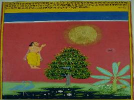 | Description / विवरण | Miniature painting based on Kalila Damana depicting a sage with folded hand praying to goddess surrounded by holy illumination. This painting has Mughal influence. |