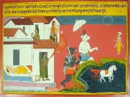 | Description / विवरण | Miniature painting based on Mahabharat - Musal parva depicting a horse where a man is depicted sleeping three women are depicted standing in the horse, two demons are depicted one holding flag and one chattri and a chariot also is depicted. |