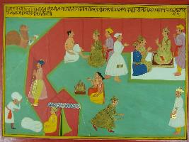 | Description / विवरण | Miniature painting based on Mahabharat - Adi parva depicting that king Janmejaya is serving to a man inside the temporary camp. On the other hand a yagna is seen and king Janmejaya is talking with two nobles. |