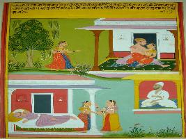 | Description / विवरण | Miniature painting based on Kalila Damana, on the upper part one couple is depicted making love and a woman coming to them. On the lower part, a sage is depicted seated, and a man sleeping with two women standing around. |