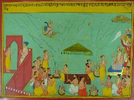 | Description / विवरण | Miniature painting based on Mahabharat - Adi parva depicting the yagna of king Janmejaya where Naga are destroyed and the king of Naga came to meet the king for save the Nagas. |