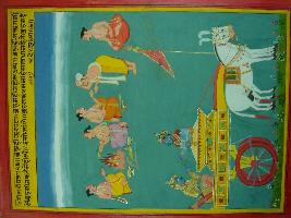 | Description / विवरण | Miniature painting based on Shri Bhagwat Gita. It depicts Krishna preaching Arjun that worship is Brahma Agni is Brahma and when a yagna is going to do then all should be my careful. |