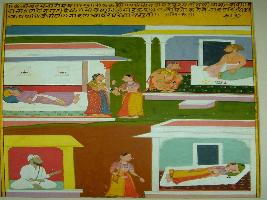 | Description / विवरण | Miniature painting based on Kalila Damana depicting a woman having affair with other woman and she is cheating her husband. |