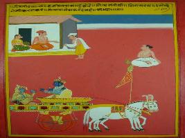 | Description / विवरण | Miniature painting based on Shri Bhagwat Gita. It depicts Krishna preaching Arjun to give shelter to whom who need it and Karma should always in favour Dharma. |