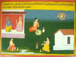| Description / विवरण | Miniature painting based on Mahabharat - Musal parva depicting a sunset fire. Two kings are depicted talking in a verandah, one man is enjoying the warmth of fire and the sun is sorrounded by three headless figures. |