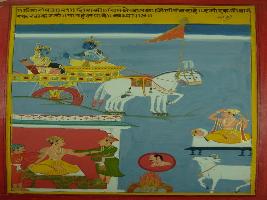 | Description / विवरण | Miniature painting based on Shri Bhagwat Gita. It depicts Krishna preaching Arjun about Karma and six and everybody should do Karma according to their health. |