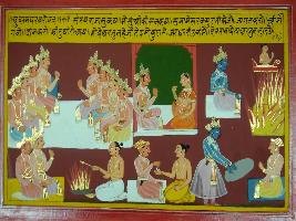 | Description / विवरण | Miniature painting based on Mahabharat - Udyam parva depicting that Sanjay is telling king that Krishna told him to tell this to all the people in court that do pray and donate what wife says. He also says that Arjun is his best friend and no one can win with Arjun and Gods also don t fight with him. |