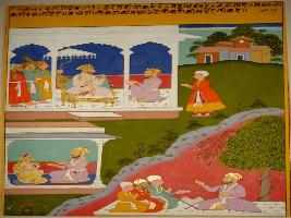 | Description / विवरण | Miniature painting based on Kalila Damana depicting a scene of palace in which king is seated on throne in front of his attendants, below minister is seated with wife, in left below minister is addressing to his people. The painting has Mughal influence. |