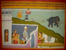 | Description / विवरण | Miniature painting based on Prithviraj Raso depicting friends of Sanjogita asking her to allow Prithviraj to go to help his army and says that Brahma will help her lover. |