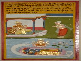 | Description / विवरण | Miniature painting based on Sarangadhar. On the top, a king is depicted sitting on throne in a palace and a man is standing in front of him. In the lower part Sheshshyayi Vishnu and Brahma are depicted. |