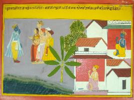 | Description / विवरण | Miniature painting based on Mahabharat - Musal parva depicting Yadavs are going behind Krishna on the bank of river. Krishna is giving them blessing and asked them to go to their home. At the left part of painting, houses are depicted with Krishna sitting inside one of house. |